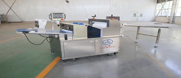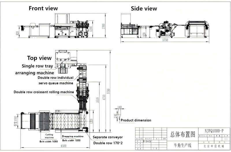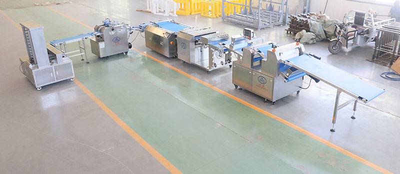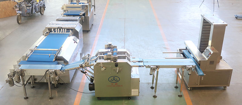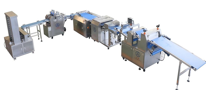 Esta linha de produção automática de croissants é composta por uma laminadora de massa de dois rolos, um cortador de massa, um alinhador e depositador de massa, uma esteira transportadora divergente de duas camadas, uma máquina de formação e enrolamento de croissants de duas pistas, uma esteira transportadora de fila e uma máquina opcional de organização automática de bandejas.