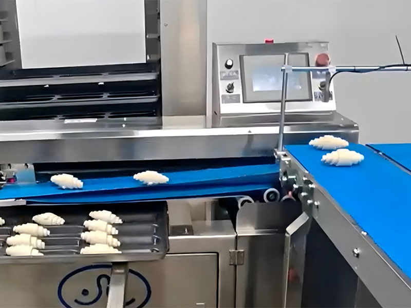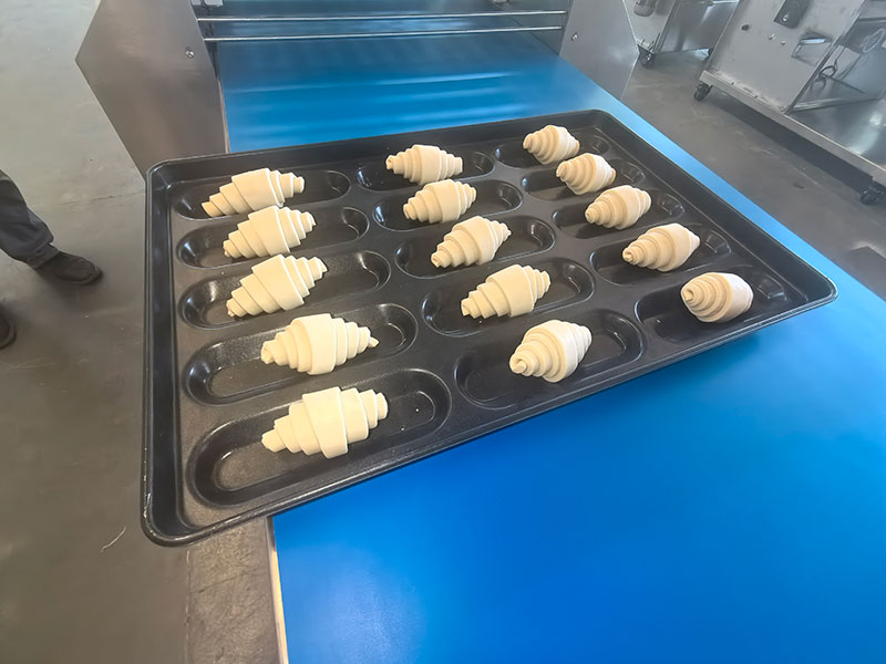 Os croissants acabados são colocados automaticamente em bandejas de cozimento, reduzindo a classificação manual e melhorando a continuidade do fluxo de trabalho em todas as etapas do processamento.