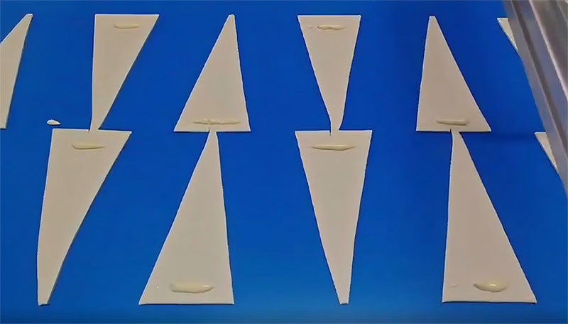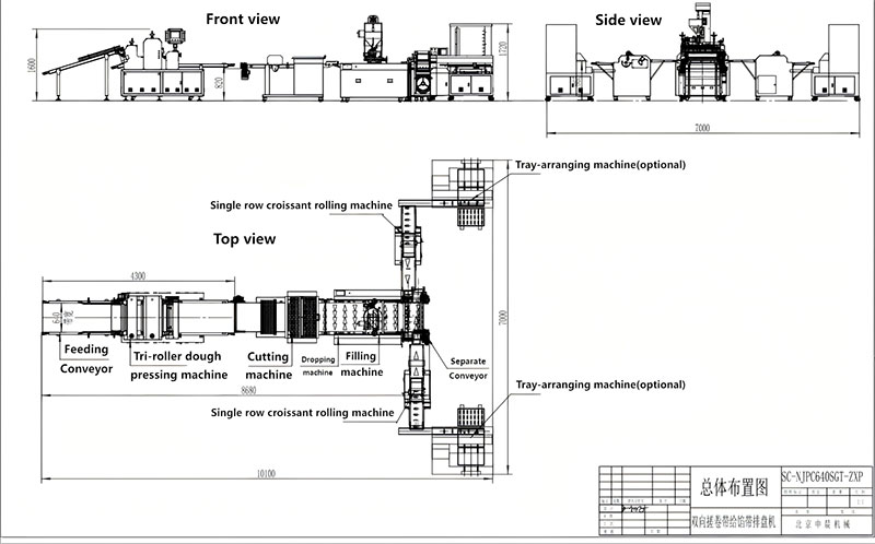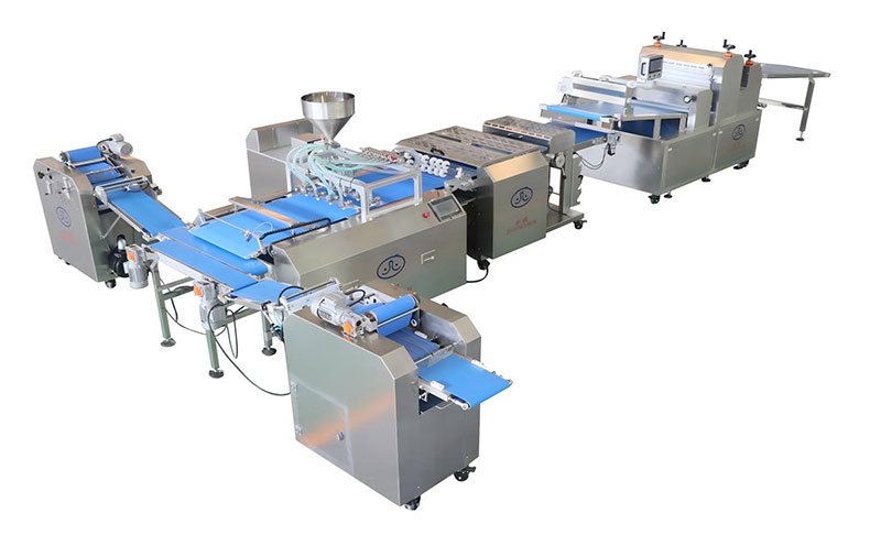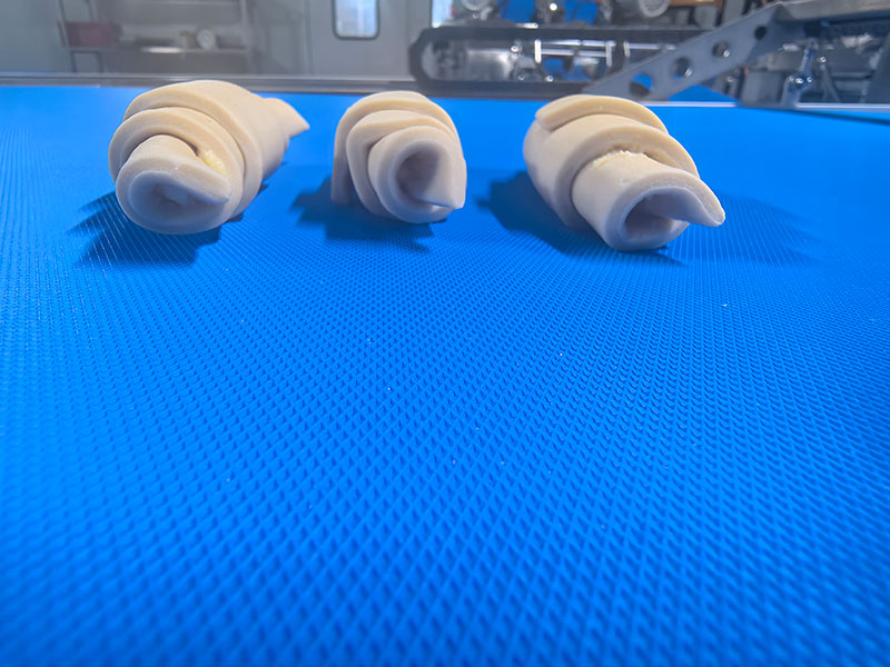A linha de produção consiste em uma laminadora de massa multi-rolo, um cortador de massa, um alinhador e depositador de massa, uma unidade de enchimento, uma esteira divergente esquerda-direita e duas máquinas de formação e enrolamento de croissants.